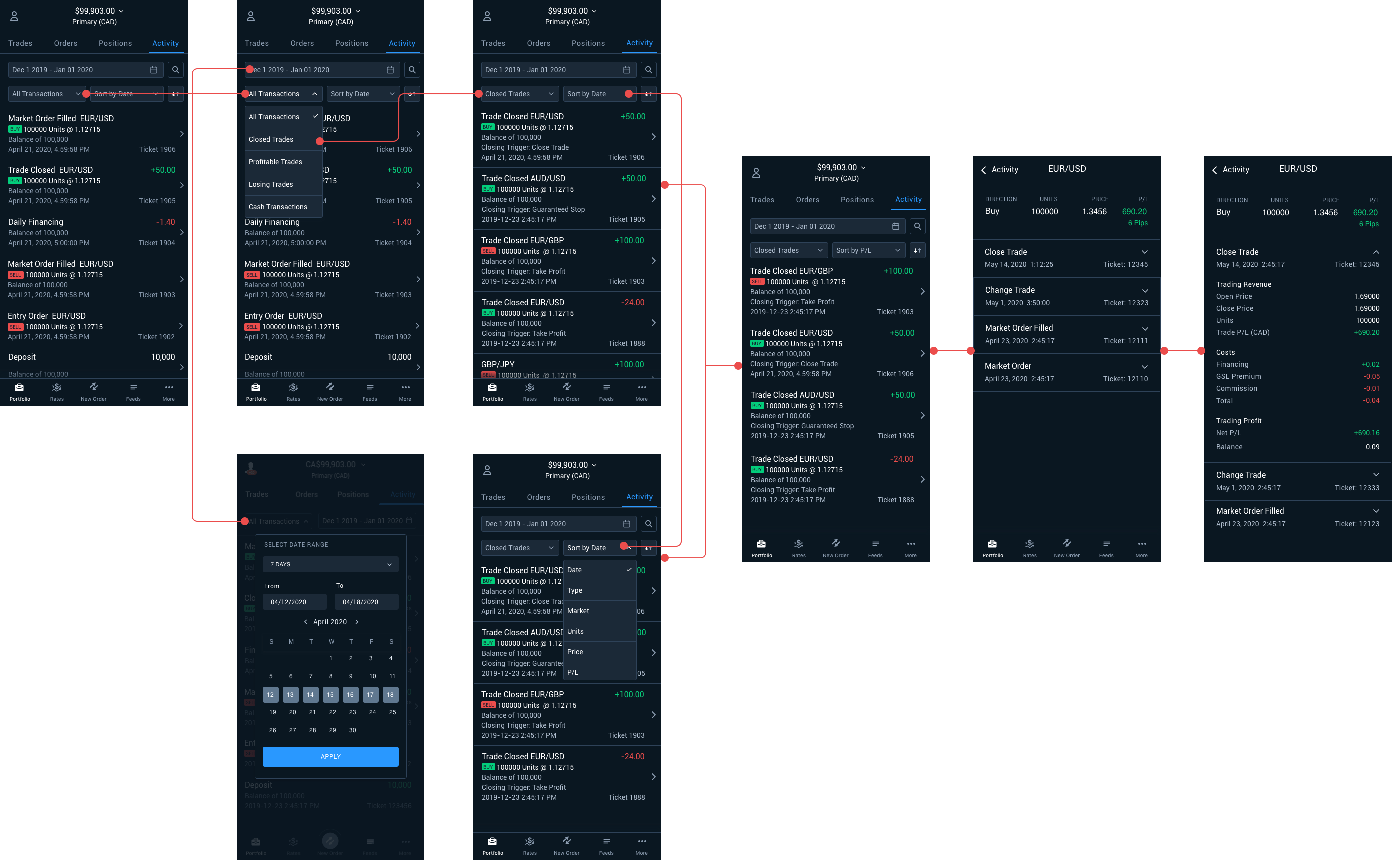 In the second iteration, we decided on the available filters, revised the detail screens to include more comprehensive information in the trade history, and refined the overall UI designs.