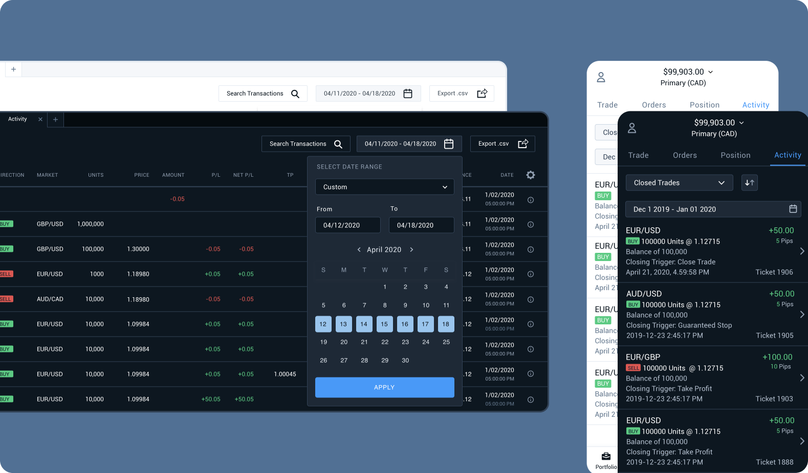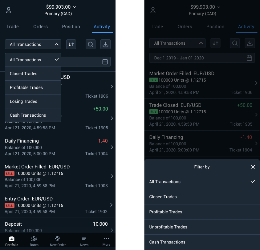 I conducted usability testing to observe how traders use these features on mobile. Actions such as downloading .csv files and searching transactions are more common on the web than on mobile. Traders expressed a strong preference for detail screens that provide more information on transactions, particularly regarding overnight financing fees. They also requested filters for closed trades, profitable trades, and losing trades.